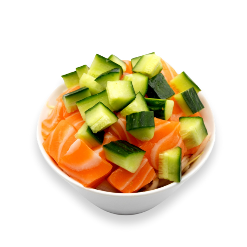 Choux vinaigré, saumon cru, concombre. Allergénes : sésame , poisson.
