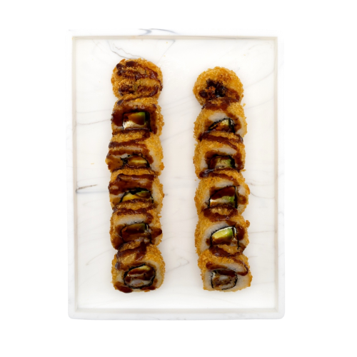 Roll frit,Tempura de crevette, avocat, cream cheese, sauce teriyaki. Allergénes: oeuf , céréale, produit laitier ,crustacé.