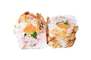 Rouleau fourré de crevette tempura, salade, coriandre, avocat, oignon frits. Allergénes: crustacé, oeuf, céréale.