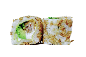 Roll de crevette tempura, avocat, cheese, coriandre, oignon frits. allergéne: produit laitier, oeuf , crustacé.