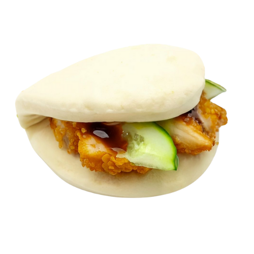 Pain chaud fourré de poulet frits, concombre, mayo spicy, sesame, teriyaki sauce. allergéne: produit laitier, oeuf , sésame, céréale .