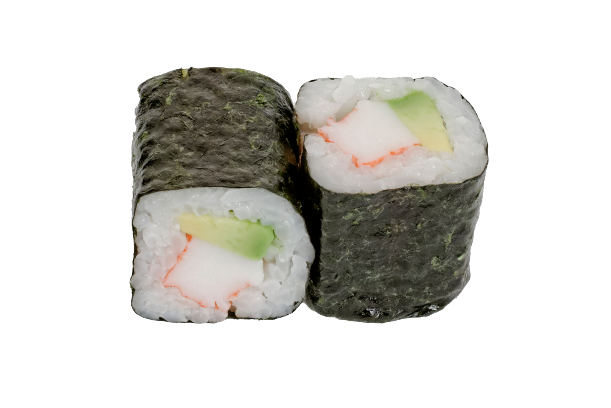 Maki entouré de feuille d'algue & fourré de riz, surimi, avocat. allergéne: crustacé.