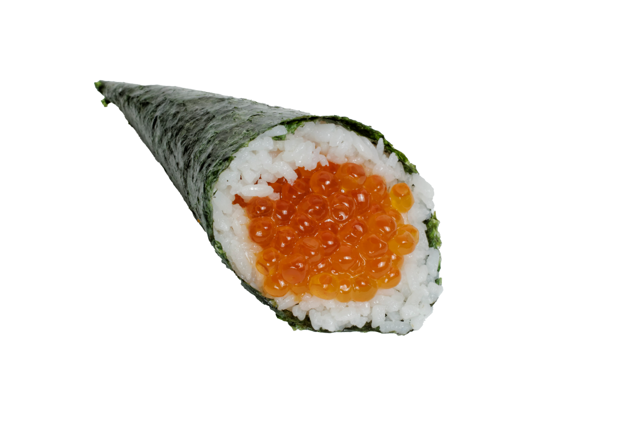Témaki entouré de feuille d'algue & fourré de riz, oeuf de saumon. allergéne:poisson.