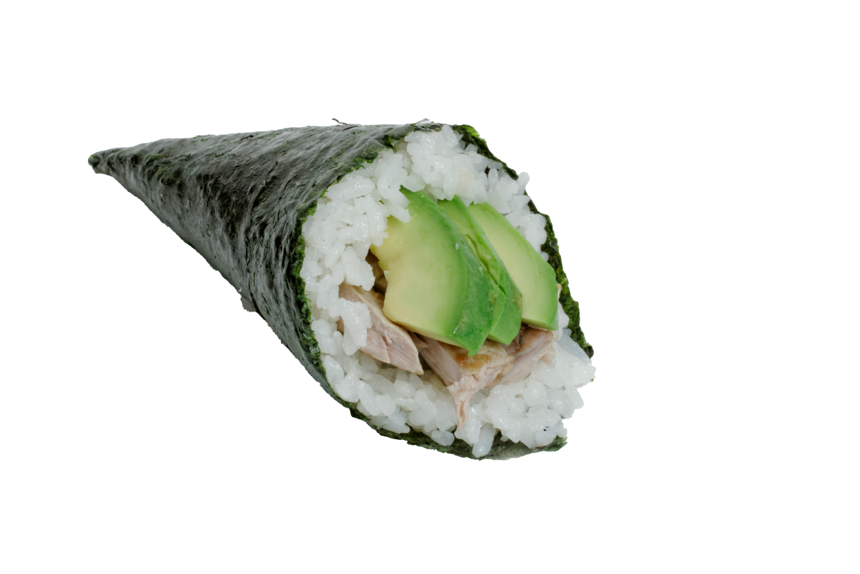 Témaki entouré de feuille d'algue & fourré de riz, thon cuit, avocat. allergéne:poisson.