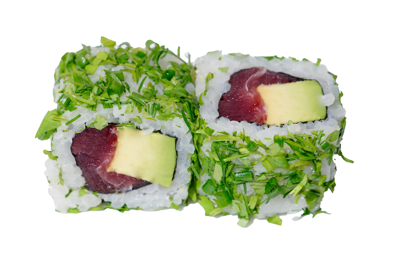 Roll entouré de ciboulette, coriandre, aneth et fourré de mayonnaise, thon cru, avocat. allergéne:poisson, produit laitier .