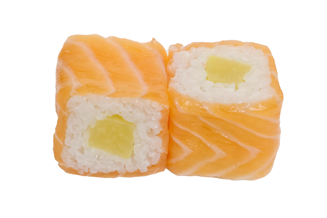 Rouleau de riz vinaigré entouré de saumon cru et fourré d'avocat. allergéne: poisson.