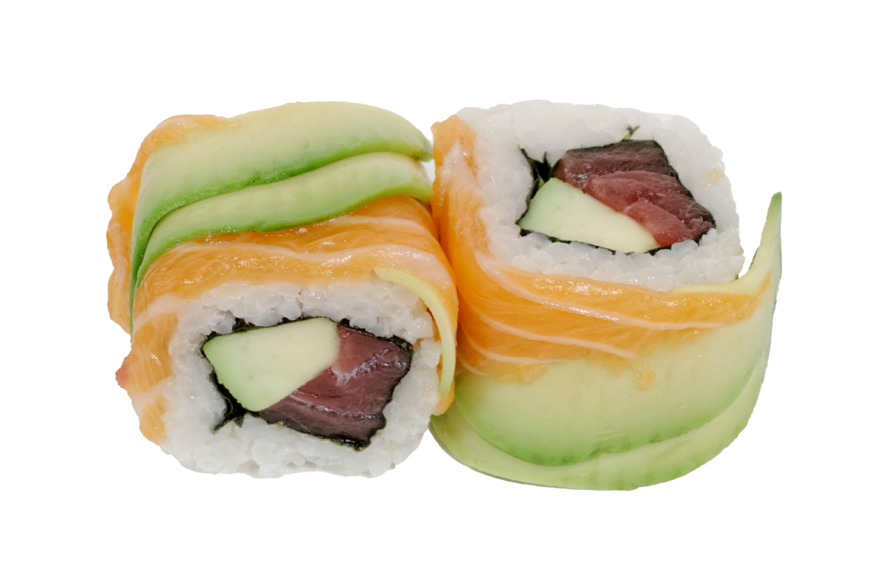 Roll de riz vinaigré , avocat, saumon, mangue. allergéne: poisson